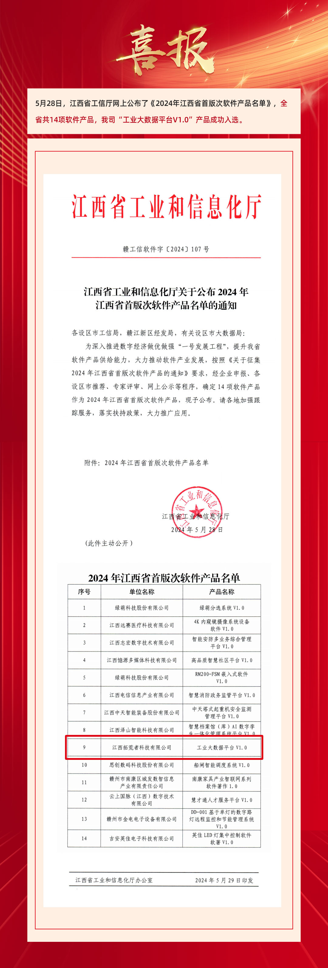 喜報!我司產品成功入選江西省工信廳《2024年江西省首版次軟件產品名單》
