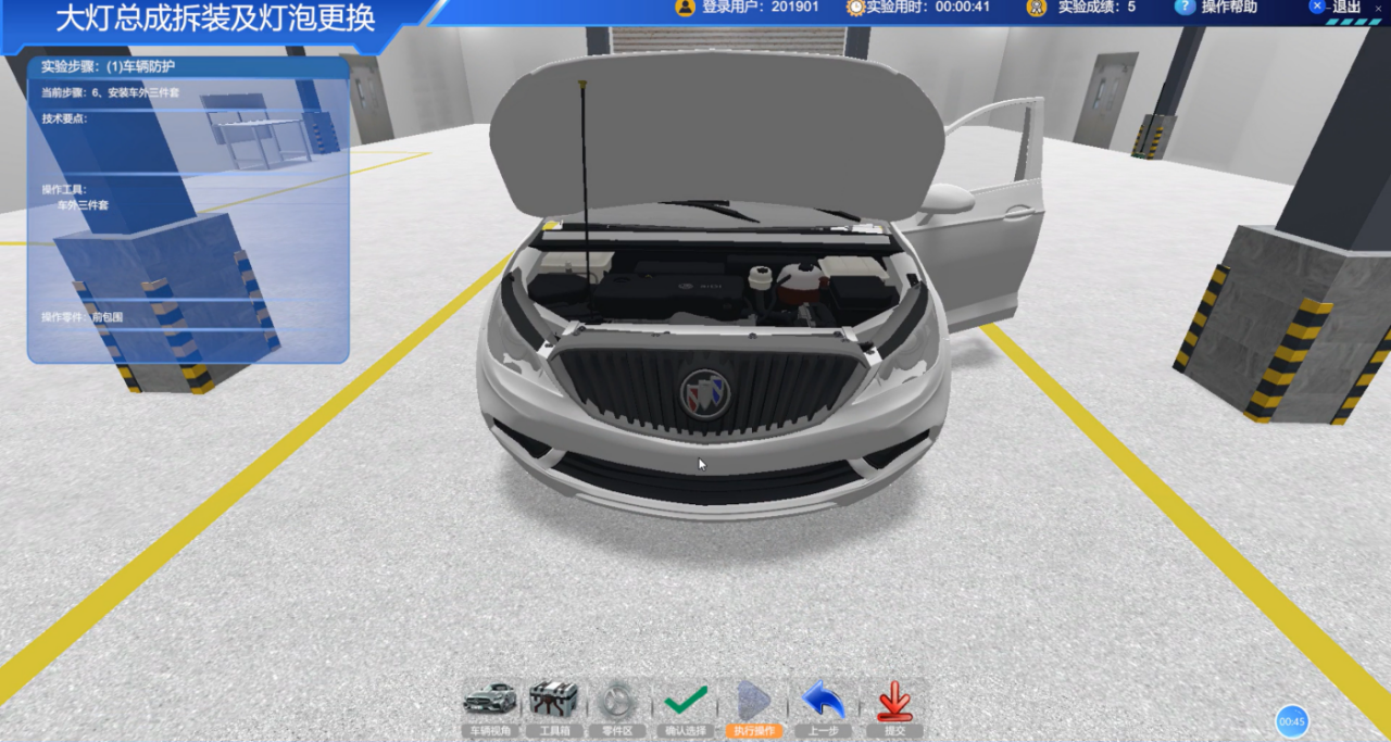 該系統采用三維建模技術構建實驗場景模型、實驗器材模型、實驗汽車模型以及相關動畫,并實現在系統內無死角漫游操作、實驗步驟交互操作、動畫播放操作、實驗考核成績等。并與現有的實驗管理平臺進行對接。